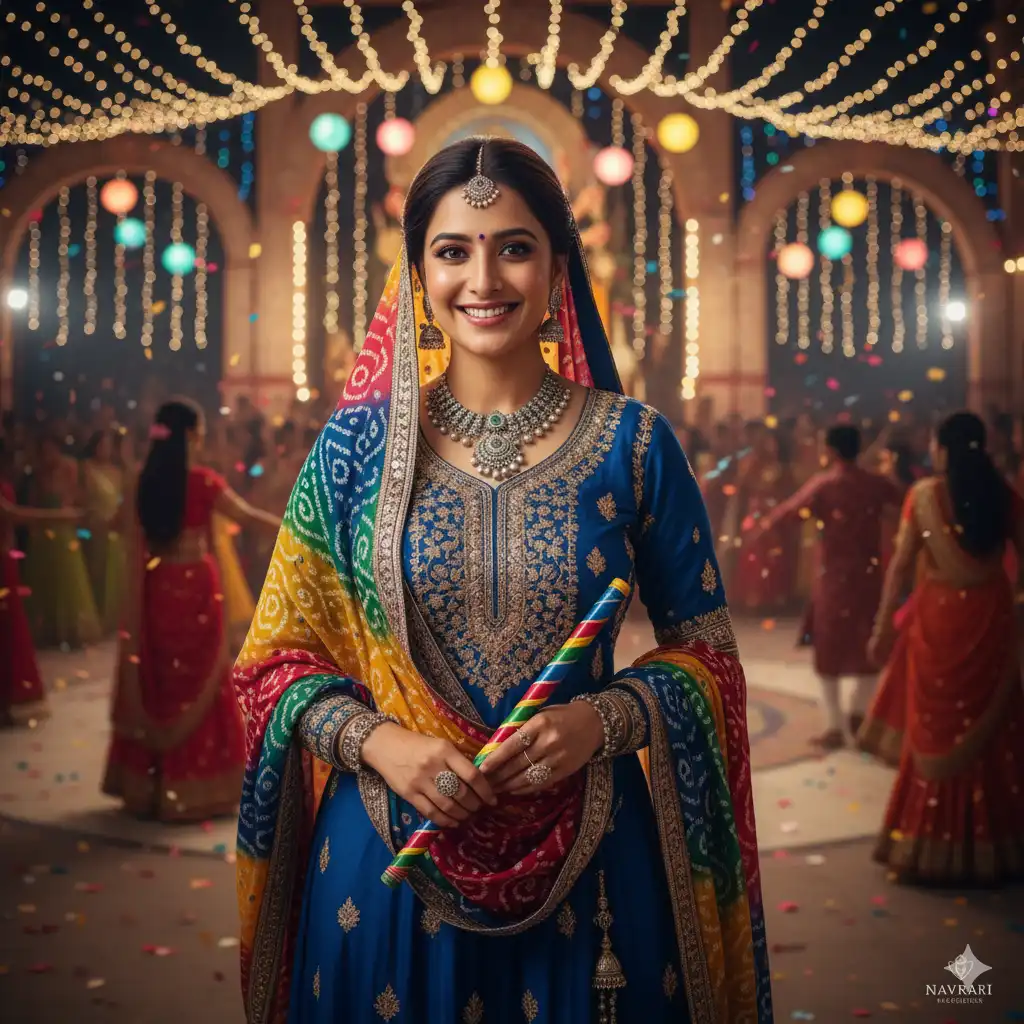 - “A close-up studio-style portrait of me in a royal blue kurta with embroidery, accessorized with a colorful bandhani dupatta and ethnic jewelry, smiling while playing dandiya under lantern-lit skies.”